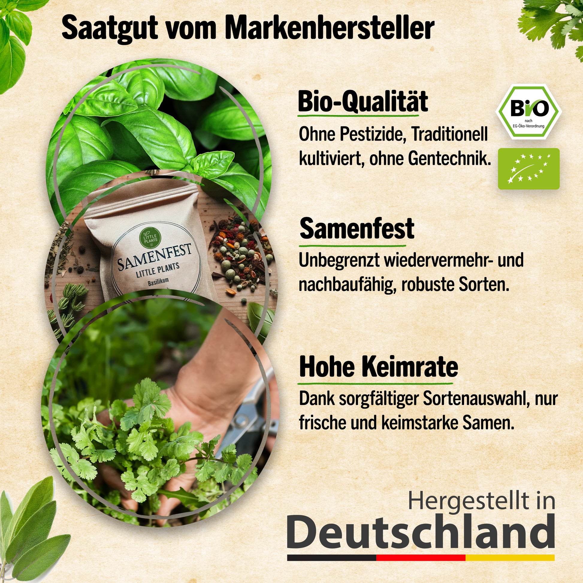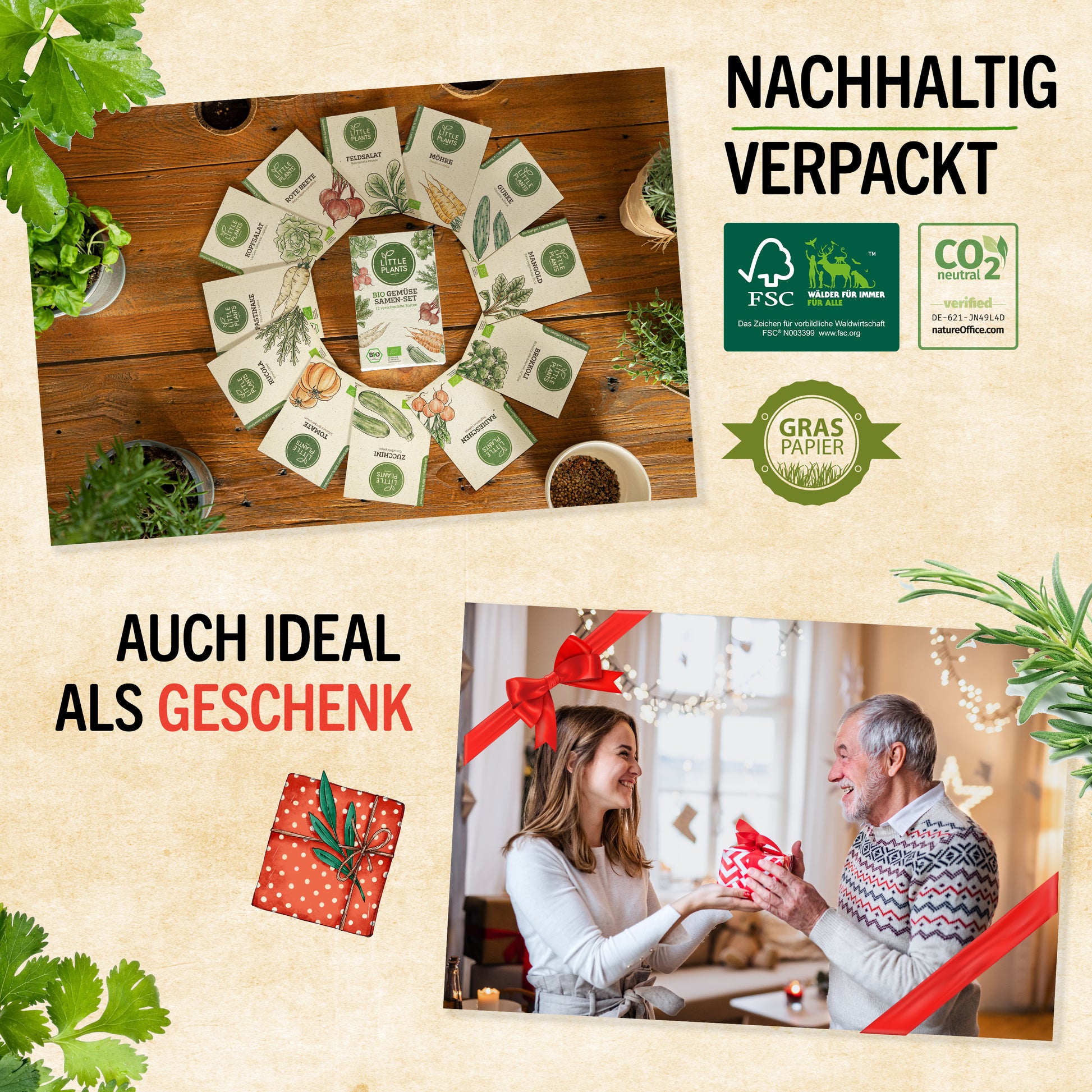 Enthaltene Sorten: Fleischtomate (Marmande), Zuchini (Courgette), Radieschen, Pastinake (True and Tender), Gurke (Marketmore), Möhre (Treenetaler), Kopfsalat (Victoria), Feldsalat (Vit), Rucola (Esmee), Mangold (Rhubarb Chard), Rote Beete, Brokkoli (Green Calabrese).